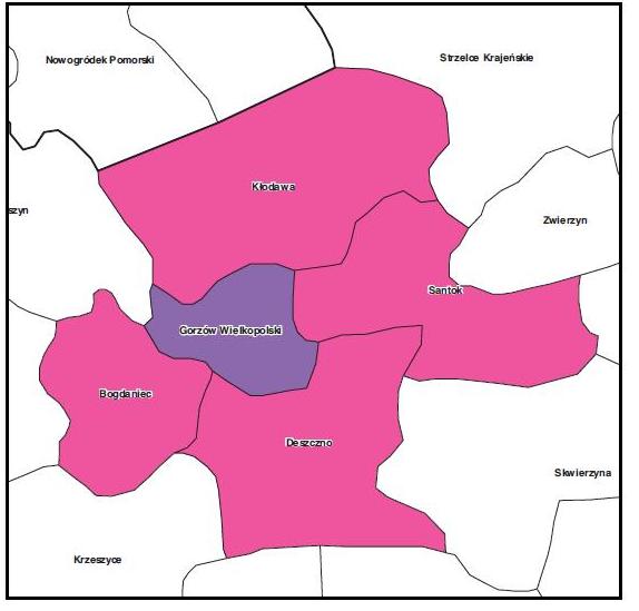 - Miejski Obszar Funkcjonalny dla Miasta Gorzowa Wielkopolskiego: Gorzów Wielkopolski – rdzeń oraz Gminy: Bogdaniec, Deszczno, Kłodawa, Santok